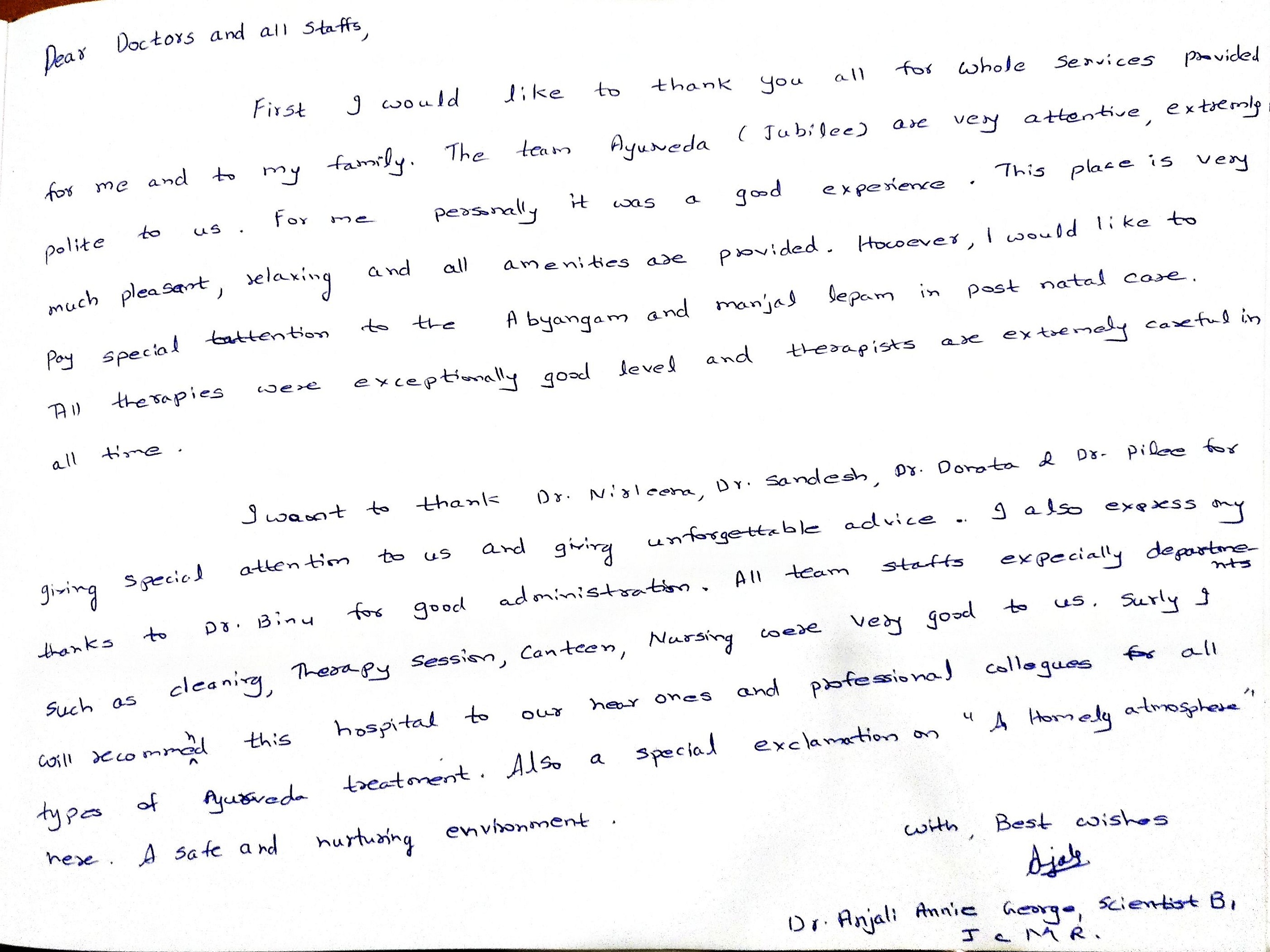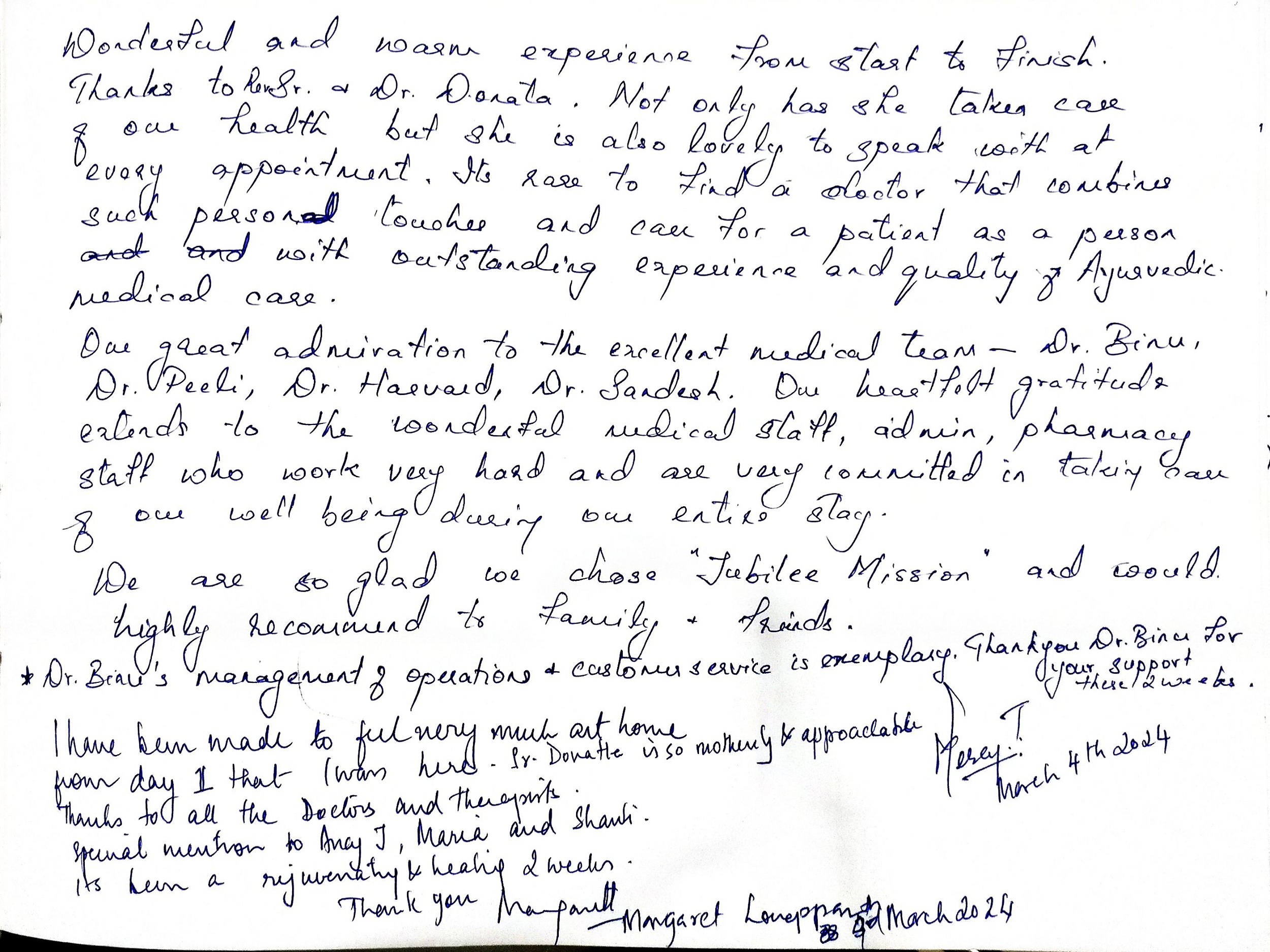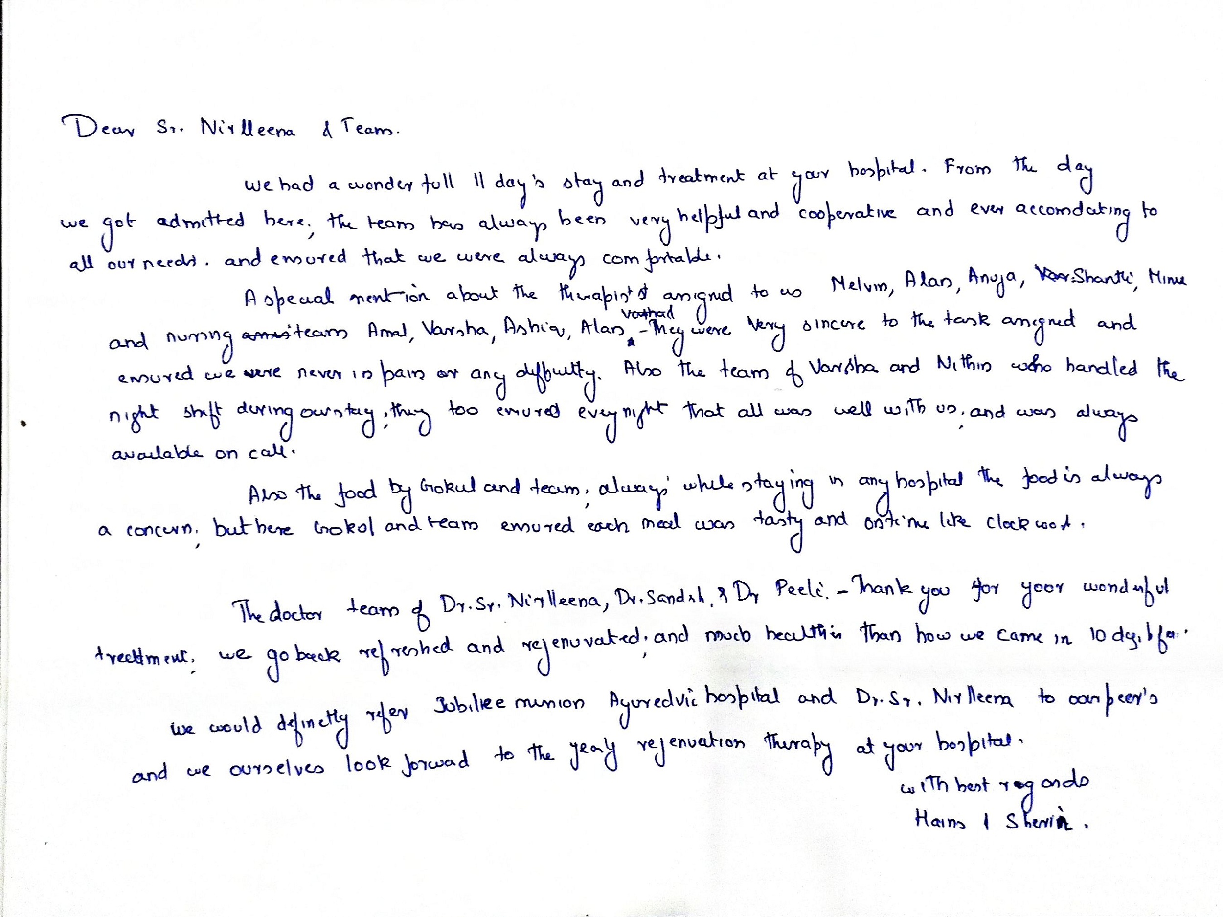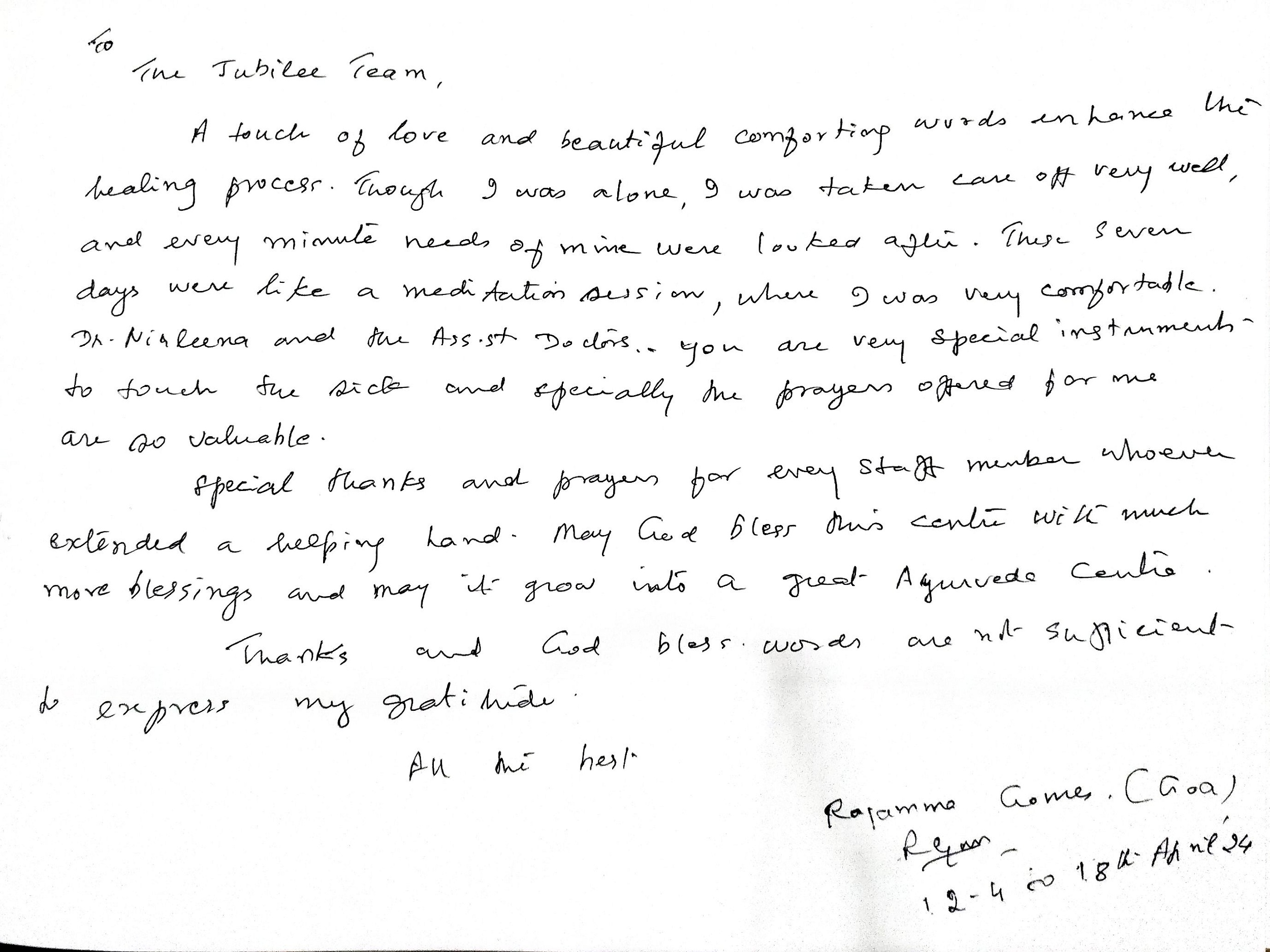 My stay at Jubilee Ayurveda was truly a 'home away from home.' I am deeply grateful to the doctors, nursing, and staff for creating a family-like atmosphere of care. Healing feels natural here. May God continue to bless this hospital and all who serve here.