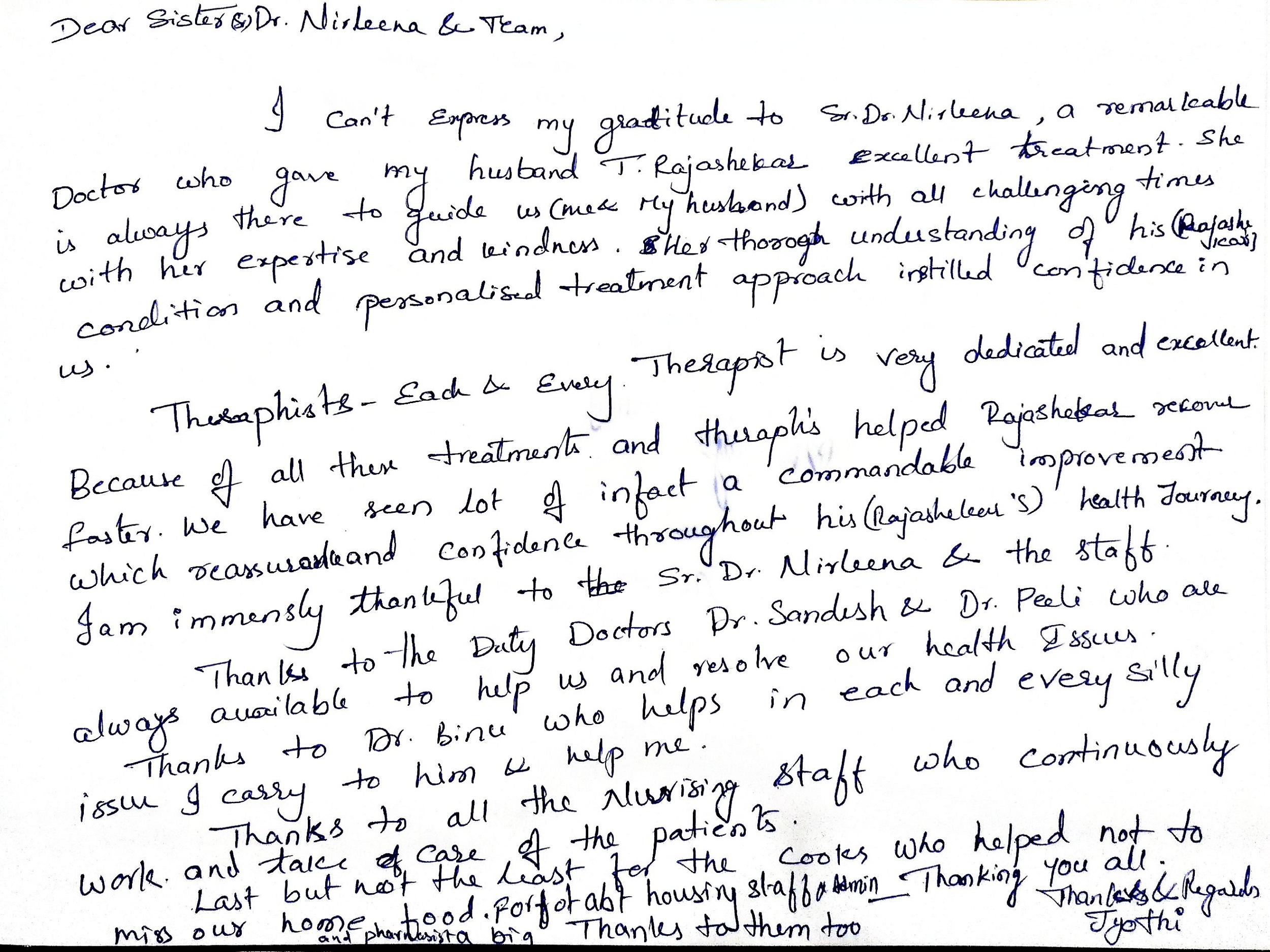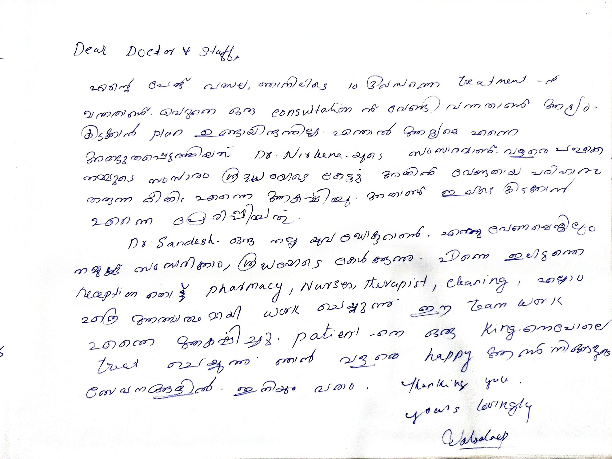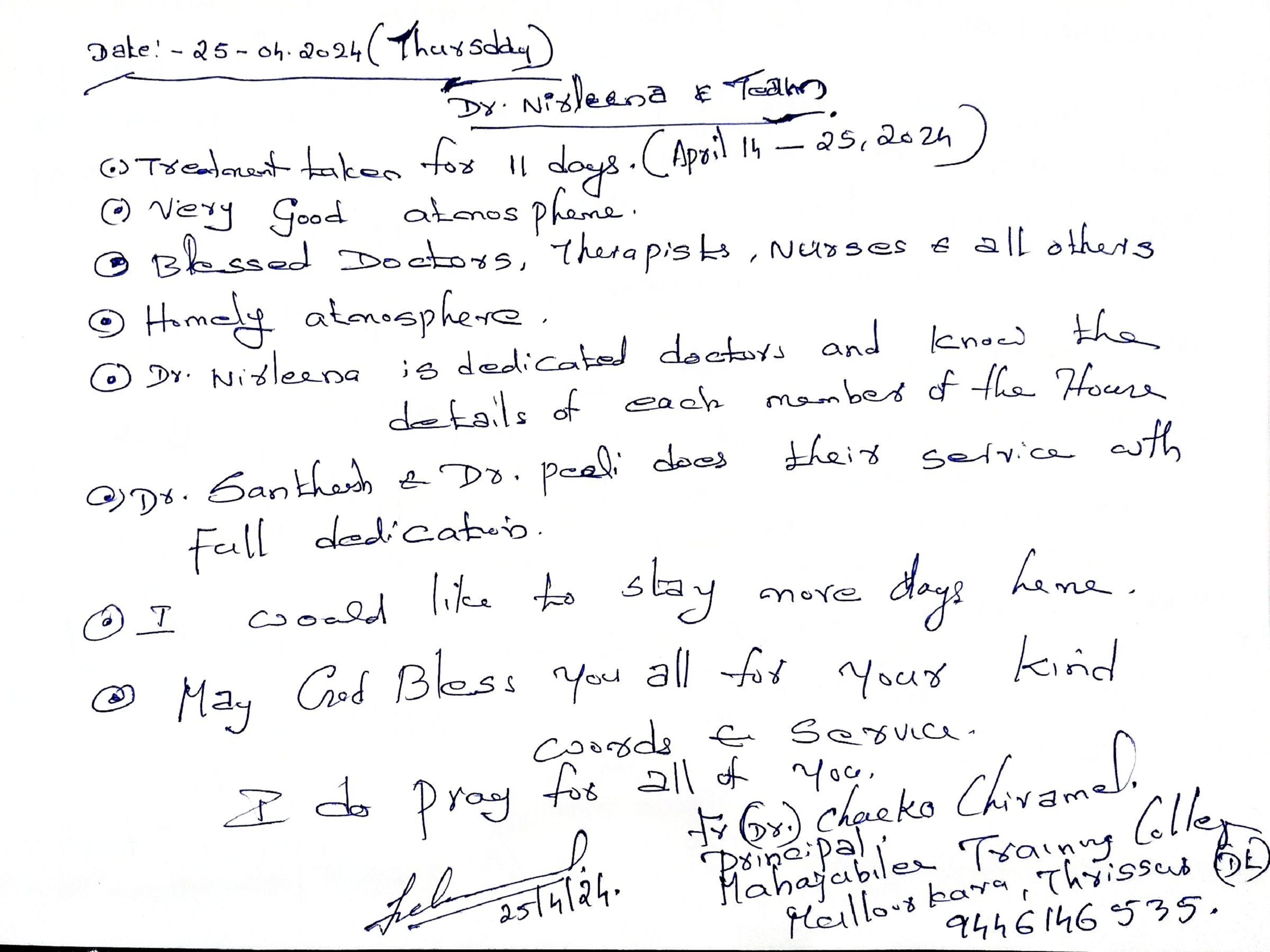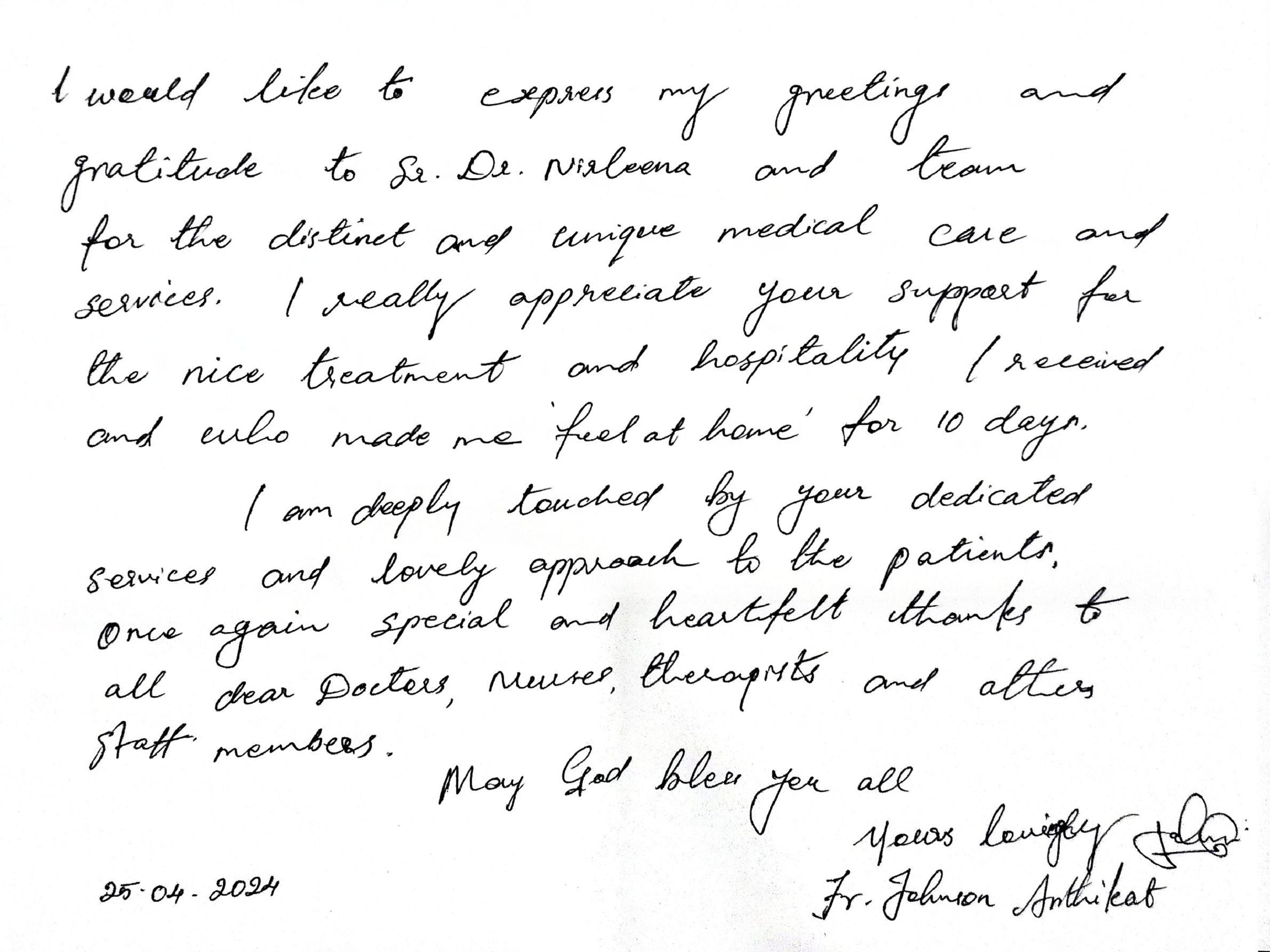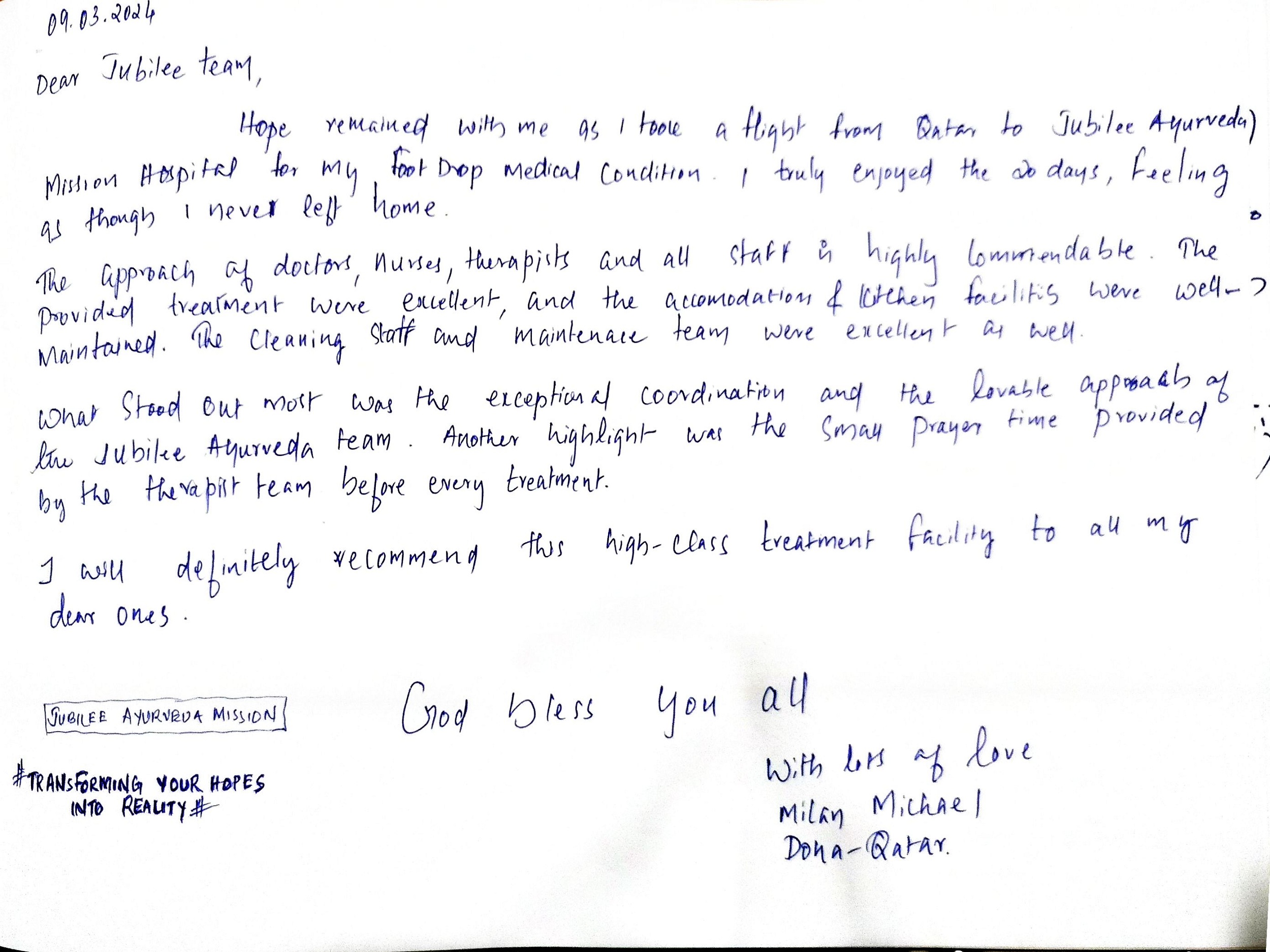 My stay at Jubilee Ayurveda was truly a 'home away from home.' I am deeply grateful to the doctors, nursing, and staff for creating a family-like atmosphere of care. Healing feels natural here. May God continue to bless this hospital and all who serve here.