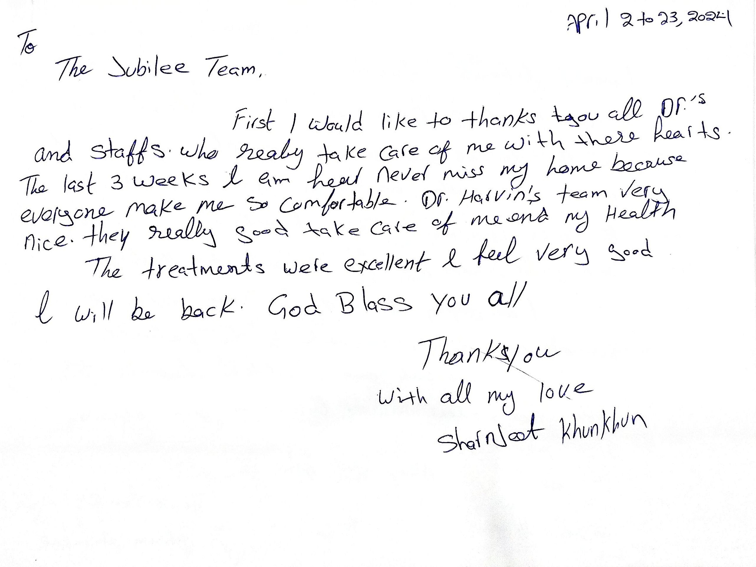 My heartfelt thanks to all the doctors and staff at Jubilee who cared for me with love. In my 3 weeks here, I never missed home, everyone made me feel so comfortable. Dr. Harvin’s team was wonderful, and the treatments excellent. I feel great and will surely be back!